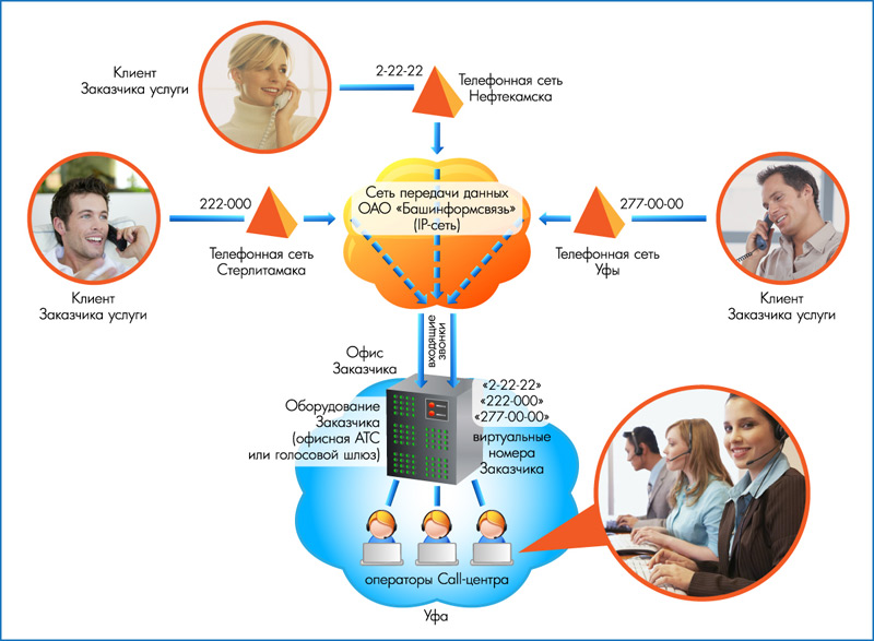 Ниже приведена схема организации услуги на следующем примере: Заказчику выделены многоканальные номера в Стерлитамаке, Уфе и Нефтекамске, при этом call-центр Заказчика услуги находится в Уфе. Клиенты Заказчика, набирая местный номер телефона, попадают на операторов единого call-центра.